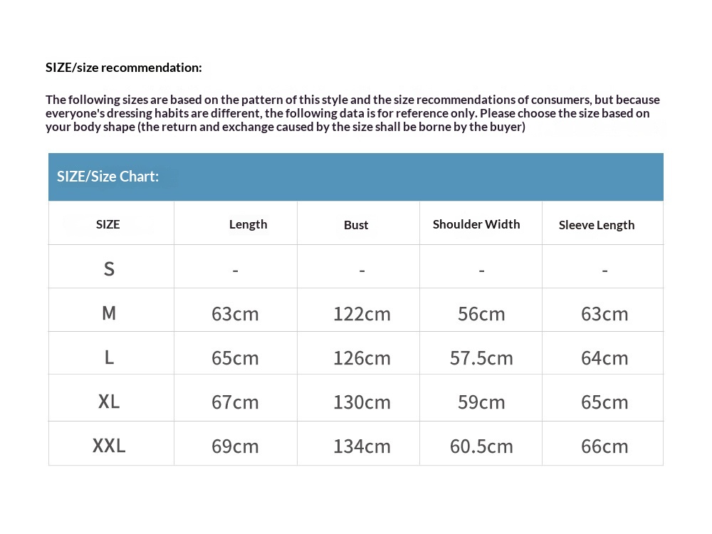 1. Asian sizes are 1 to 2 sizes smaller than European and American people. Choose the larger size if your size between two sizes. Please allow 2-3cm differences due to manual measurement. 2. Please check the size chart carefully before you buy the item, if you don't know how to choose size, please contact our customer service. 3.As you know, the different computers display colors differently, the color of the actual item may vary slightly from the following images.